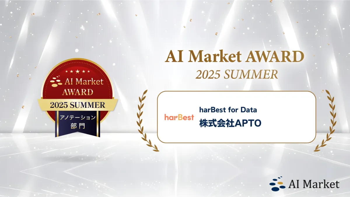 株式会社APTOが、AI活用支援サービス「AI Market」が主催する「AI Market AWARD 2025 Summer」で、【アノテーション部門】の受賞企業に選ばれました。この受賞は、APTOが提供するソリューション、特に「harBest for Data」に対する評価によるものです。