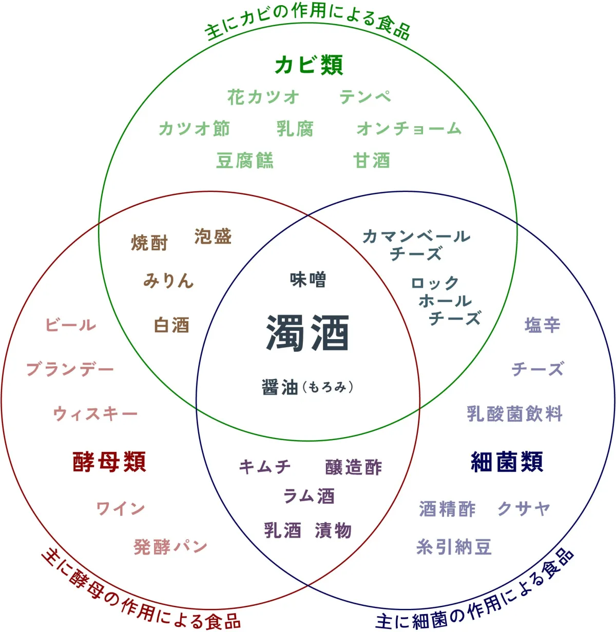 発酵食品とは、目に見えない微生物たちが食材の性質を変化させて人間にとって有益な食品を生み出すものです。代表的な微生物は糀菌、乳酸菌、酵母の3種類。それぞれが特異な役割を果たし、世界中で多様な発酵食品が生まれています。その中で、糀菌は日本の国菌であり、特にこの国特有の発酵食品を分類するキーとも言える存在です。味噌や醤油、そしてどぶろくは、まさにこの糀菌を含む日本の伝統的な発酵食品です。