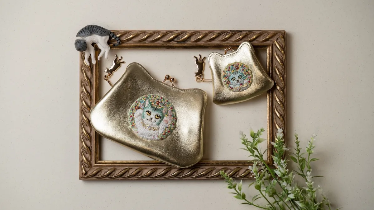 今回発表された「Hiroe Takagiコラボ_刺繍入りがま口シリーズ」は、がま口ミニウォレットとマイクロがま口ポーチから成ります。これらは、メタリックレザーに手刺繍を施した特別なデザインで、愛らしいネコのキャラクター「aoちゃん」が刺繍されています。ビーズやスワロフスキーを使用し、華やかさと個性を兼ね備えたアイテムとなっています。