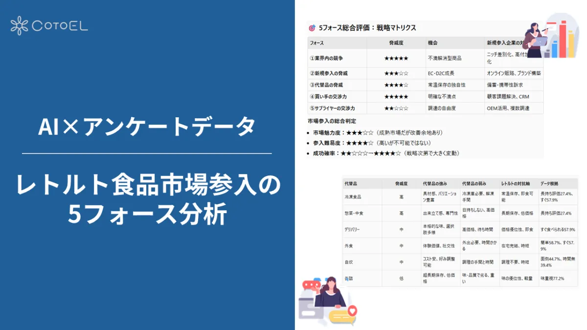 食品市場は今、さまざまな選択肢が広がっています。レトルト食品や冷凍食品、中食惣菜と、家庭の食卓における選択肢が急増している中、マイボイスコム株式会社が行った調査結果が注目を集めています。この調査は、AI分析ツール「CotoEL」を使ったもので、レトルト食品市場の現状と新規参入の可能性を探るための5フォース分析が行われました。