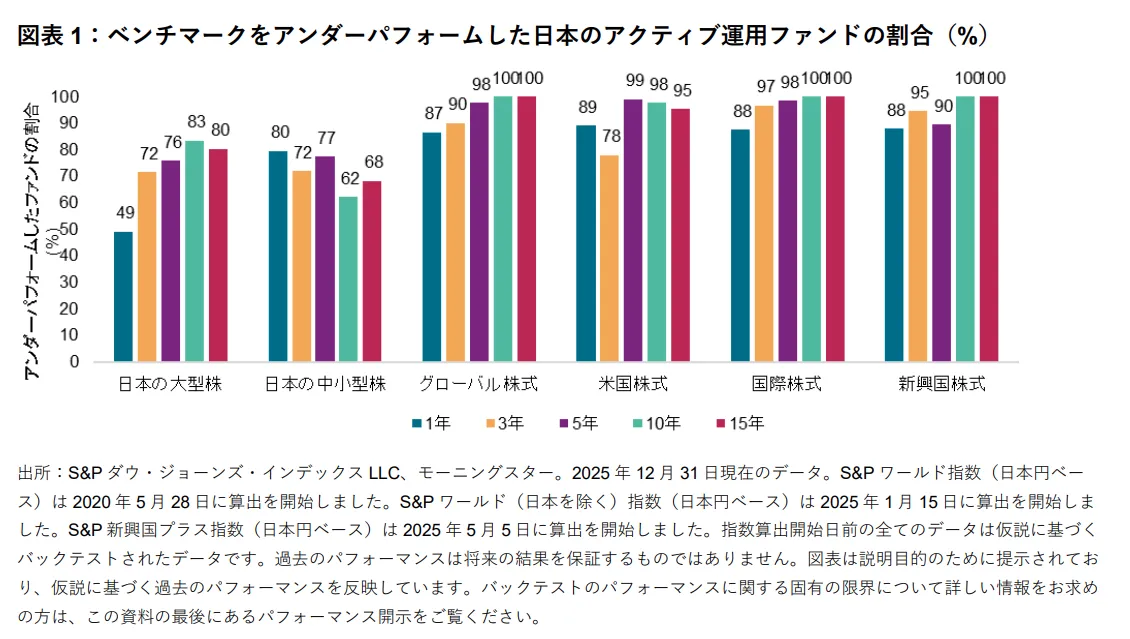 S&P ダウ・ジョーンズ・インデックス(S&P DJI)は、2025年における日本のアクティブ運用大型株ファンドのパフォーマンスについての最新レポートを発表しました。これによると、日本の大型株ファンドの49%がS&P/TOPIX 150指数をアンダーパフォームするという厳しい結果が示されました。この数値は、2017年以来で最も低いレベルとなっています。
