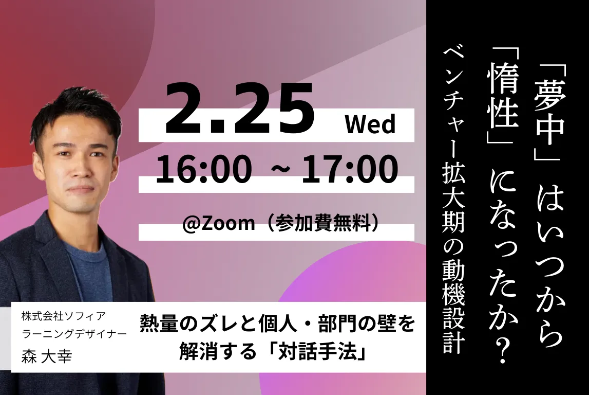2月25日に開催されるセミナー「夢中」は、企業が成長する過程で直面する社員のモチベーションの変化をテーマにしています。特に、30人以上の組織になると、創業当初の熱意が薄れがちであることが多く、メンバー間の温度差を感じる経営者やマネージャーのための内容となっています。