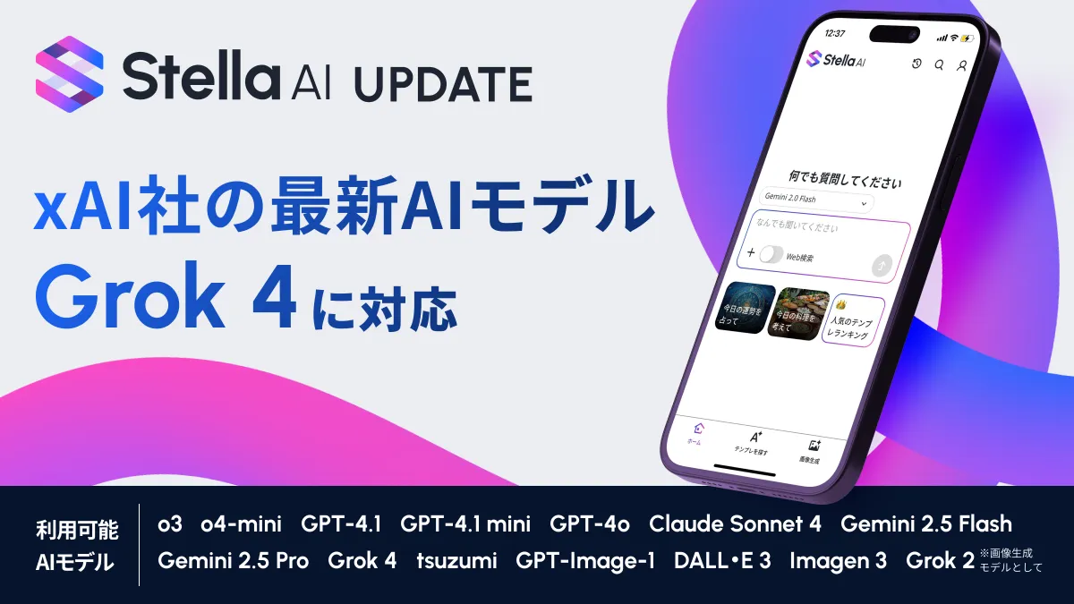 生成AIサービスの分野で急成長を遂げている株式会社SUPERNOVA(東京都港区、代表取締役社長:木本東賢)は、同社のマルチAIプラットフォーム「Stella AI」および「Stella AI for Biz」に、xAI社の最新モデル「Grok 4」を2025年7月11日より追加することを発表しました。