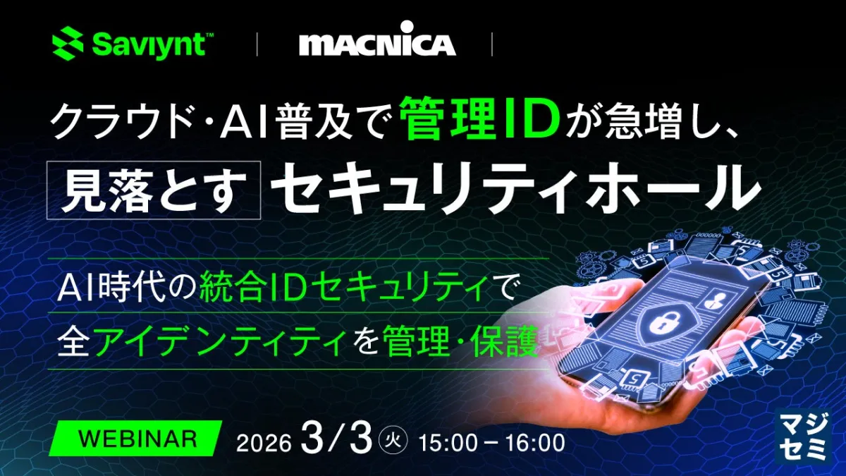 主催者はSaviynt Inc.と株式会社マクニカで、協力として株式会社オープンソース活用研究所とマジセミ株式会社が加わります。ウェビナーの詳細や参加申し込みについては、マジセミのウェブサイトをご覧ください。
