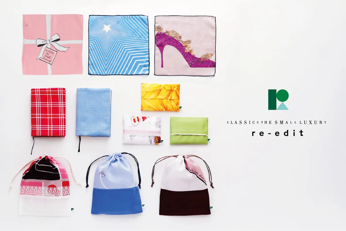ブルーミング中西は、自社ブランド「CLASSICS the Small Luxury」の中で特に人気の高い「re-edit(リ・エディット)」シリーズを発表します。このシリーズは、製造過程で生じる小さなキズや汚れがついたハンカチーフを活かす形で商品化されます。これらのアイテムは、ブックカバー、ポーチ、ティシュケースなどの形で展開され、リメイクの魅力を伝えます。