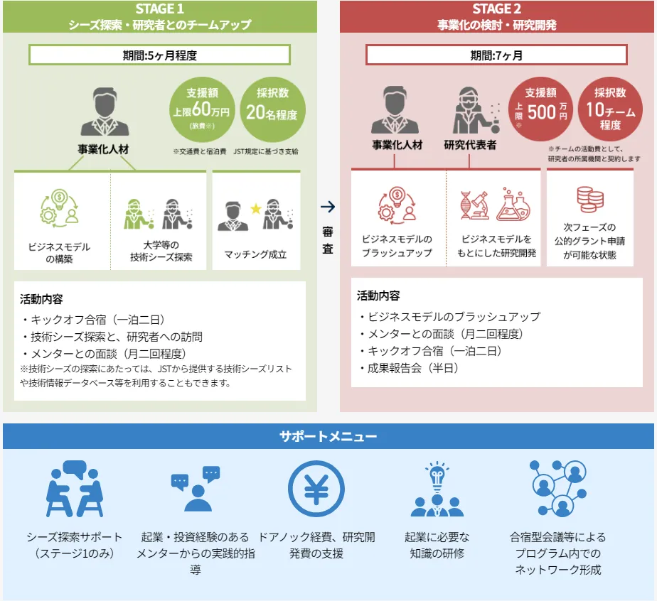 このプログラムは、主に2つのステージに分かれており、現在は第2期のステージ1参加者を募集中です。参加者は、未来の企業経営者としての第一歩を踏み出すことが期待されています。特に、ステージ1では、大学等における技術シーズの探索活動や、ビジネスモデルの構築を中心に支援が行われます。