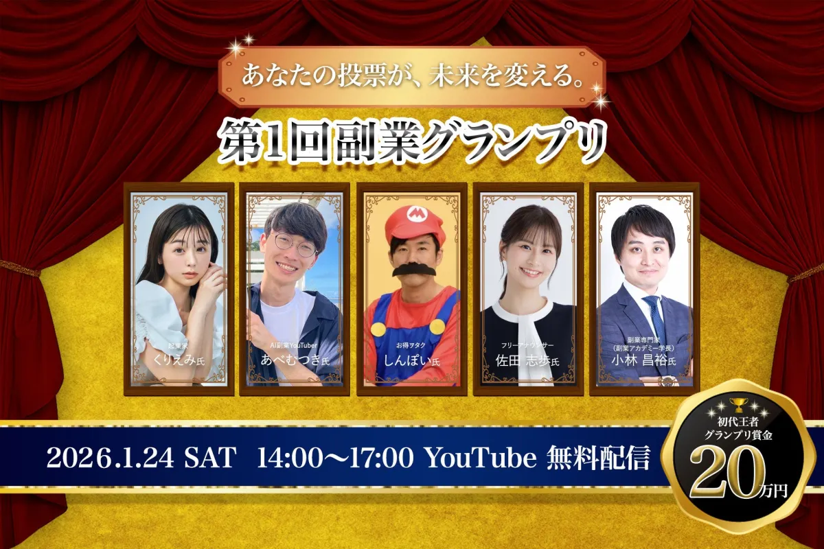 2026年1月24日(土)に「第1回副業グランプリ」が開催されることが決定しました!このイベントは“守りの本業×攻めの副業”をテーマにしており、全国から集まった実践者が「稼ぐ力」を競い合います。月収100万円を超えた挑戦者たちがそれぞれ再現性のある成功ストーリーをプレゼンテーションし、審査員の評価によって初代グランプリと賞金20万円が決まります。このリアルなイベントは、副業によって人生を変えるその瞬間を私たちに提供してくれることでしょう。