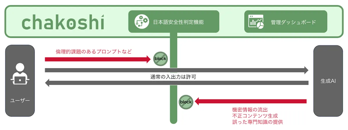 「chakoshi」は、入出力される日本語テキストの安全性を高精度で判別する機能を持っています。具体的な機能は以下の通りです: