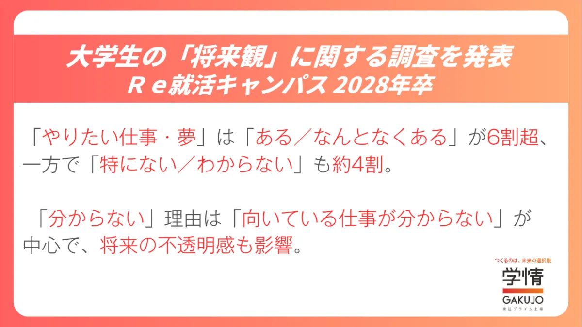 調査は2026年3月から4月にかけて、スカウト型就職サイト「Re就活キャンパス」に訪れた576人を対象に行われました。質問内容では「将来、明確な『やりたい仕事』や『夢』があるか」を尋ね、一部の調査結果をまとめることで、大学生が抱える将来への迷いを探ります。