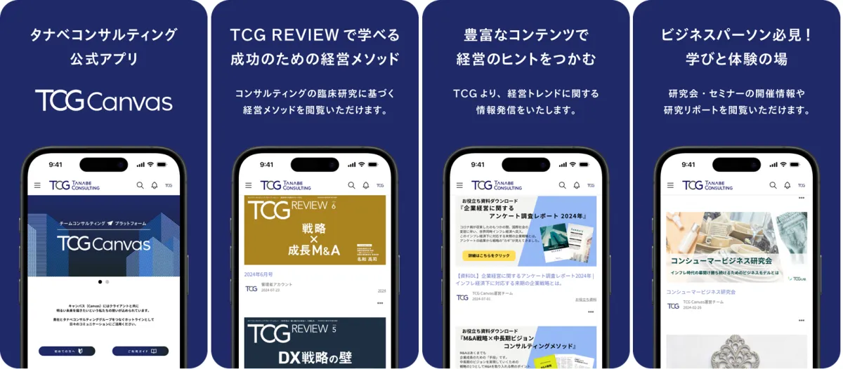 「タナベアプリ」を使うことで、タナベコンサルティングが毎月発行しているビジネス情報誌『TCG REVIEW』の最新号を無料で閲覧できるほか、有識者のコラムやコンサルタントからのアドバイスも手軽に得ることができます。また、経営トレンドを反映した無料ウェビナーや、各種研究会・セミナーの開催情報、リポート資料など、役立つコンテンツが豊富に揃っているのが特徴です。