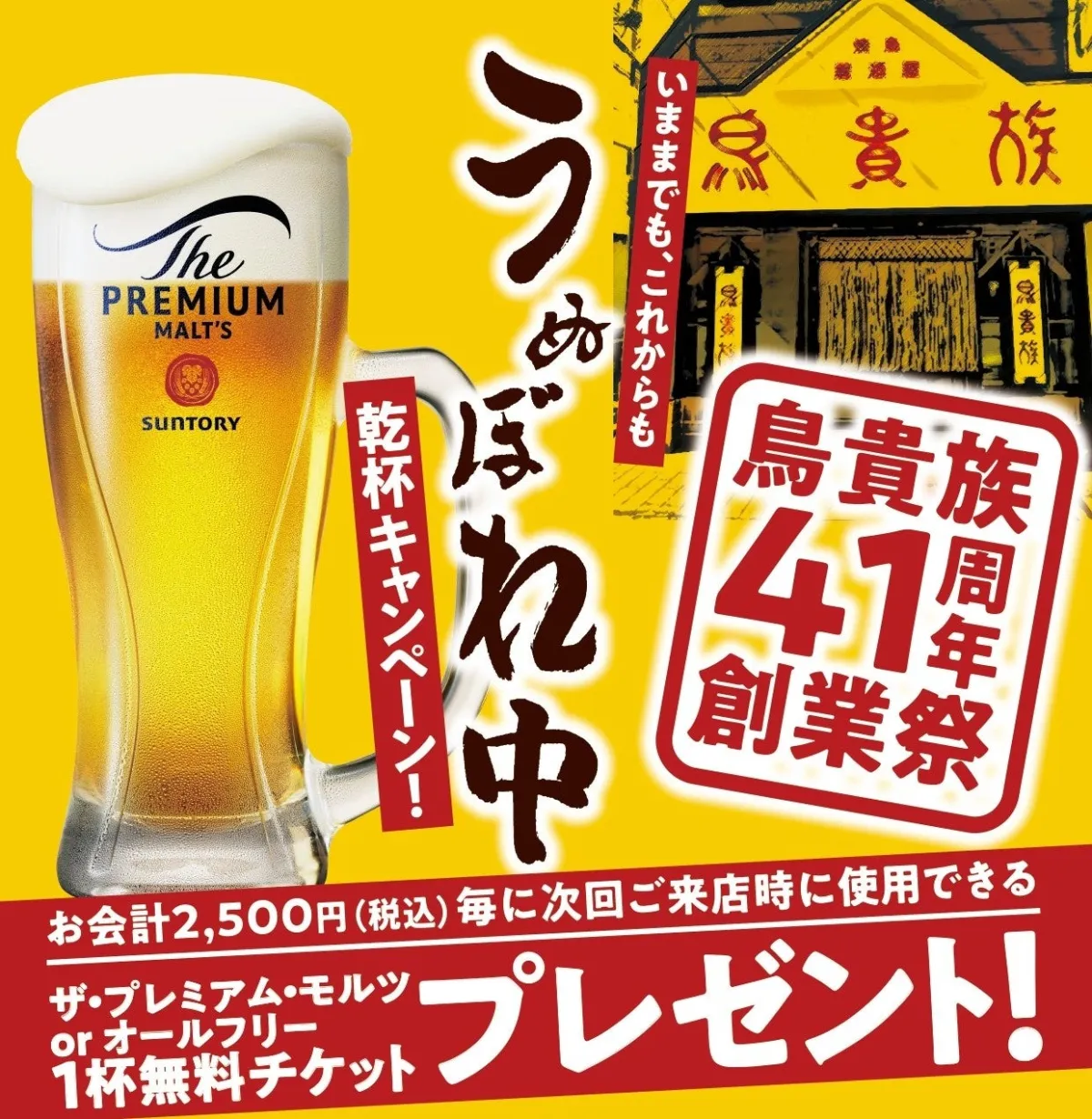 焼鳥屋「鳥貴族」が、2026年5月1日で創業41周年を迎えることを記念して、特別なキャンペーンを実施します。このイベントの名は『いままでも、これからも「うぬぼれ中」乾杯キャンペーン!』。これは、鳥貴族を支えてくださったお客様への感謝の意を込めたものです。