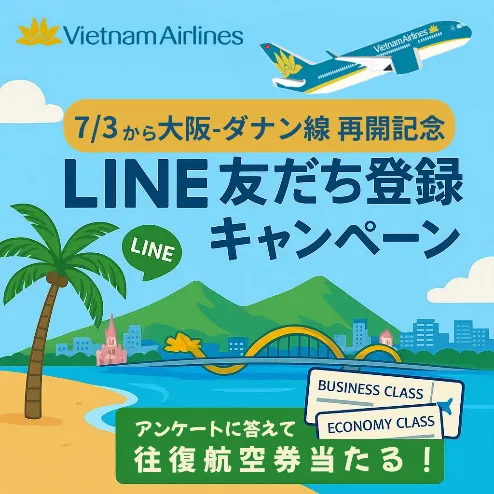 ベトナム航空が2025年7月3日から大阪とダナンを結ぶ直行便を再開することを記念し、特別なキャンペーンを実施します。このキャンペーンは、2025年5月9日から5月22日の期間中、ベトナム航空の公式LINEアカウントを友達登録することで参加可能です。