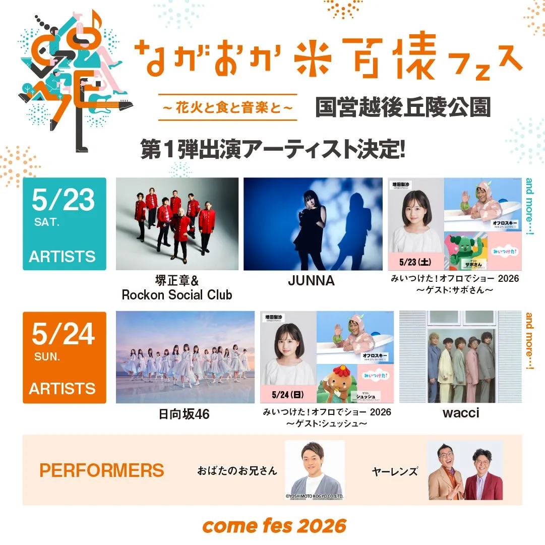 2026年5月23日と24日の2日間にわたり、新潟県の国営越後丘陵公園で「ながおか 米百俵フェス 〜花火と食と音楽と〜 2026」が開催されます。年々進化を遂げるこのフェスティバルは、音楽や食、さらには壮大な花火といった多彩な魅力が一堂に集まるイベントです。この度、第一弾の出演アーティストが発表され、音楽ファンのみならず、家族連れの皆さんも楽しめる内容となっています。