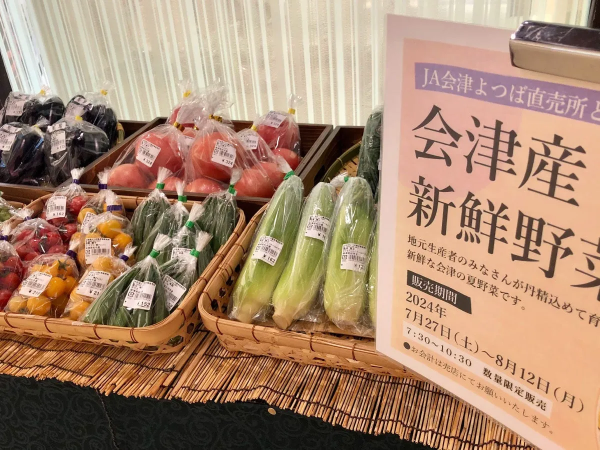 「会津産新鮮野菜市」では、毎朝採れたての野菜を販売し、収穫量が多い夏場に出荷できない商品も取り扱います。また、販売後には残った新鮮野菜がレストランの夕食メニューとして提供されます。この取り組みを通じて、食材の無駄を減らすことに寄与します。