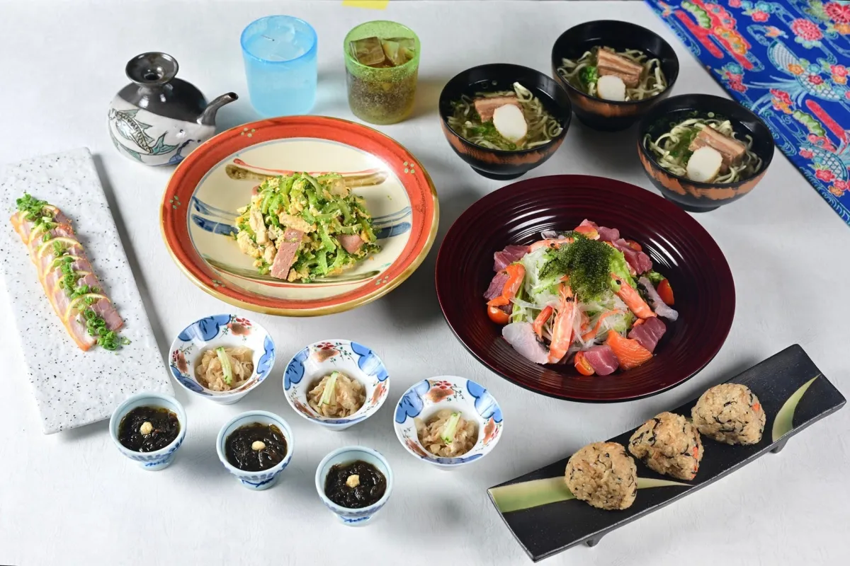 ラフテー、特製の出汁巻き玉子、新鮮な魚介を使ったお造り、「仲宗根糀家」の塩糀で仕上げた若鶏の唐揚げなど、多彩な料理が揃っています。居酒屋メニューに加え、御膳料理やしゃぶしゃぶ、鉄板焼きのコースも用意されています。