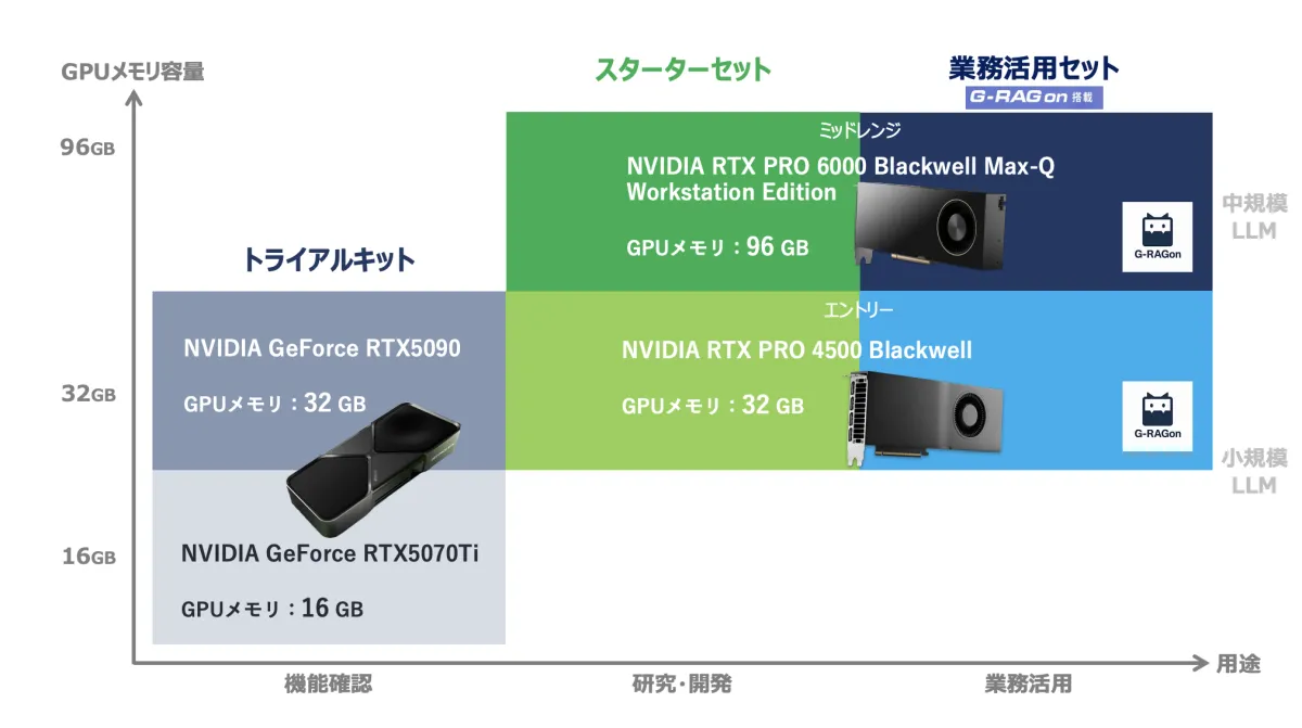 - - 業務活用セット:独自開発ツール「G-RAGon」を備えた本格的なモデルで、業務の生産性向上を図ります。