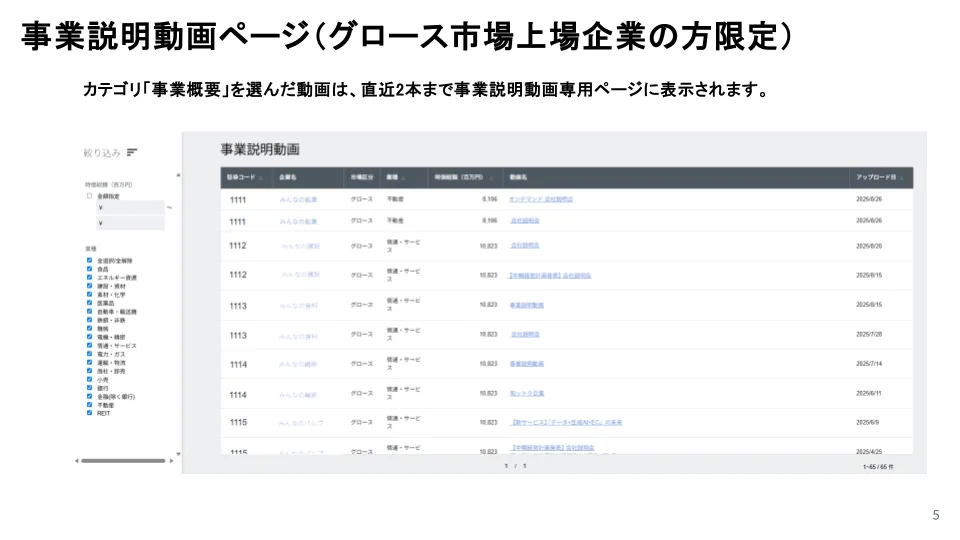 「みんなの説明会」内に新たに特設ページが設けられ、事業説明動画を視聴できるサービスが開始されました。投資家は、時価総額や業種での絞り込み、並べ替え機能を使いながら、興味のある企業を簡単に見つけることができます。