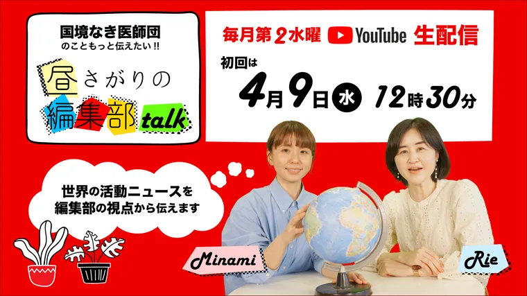 国境なき医師団(MSF)は、全世界70か国以上で医療・人道援助活動を行い、緊急時に必要な支援を求められる際には先駆的な役割を果たしています。その活動をさらに広く伝えるため、2025年4月9日より毎月第2水曜日の12時30分から、YouTubeライブ番組「国境なき医師団のこともっと伝えたい!昼下がりの編集部talk」を配信することが決定しました。この番組では、国境なき医師団の広報部の編集チームが活動内容や現地での人道危機について独自の視点から語り、特に10代から20代の視聴者に向けてわかりやすい内容で構成されています。これまで同団体の活動に興味がなかった方々でも楽しめる内容を心掛けているため、様々な人に楽しんでもらえることでしょう。