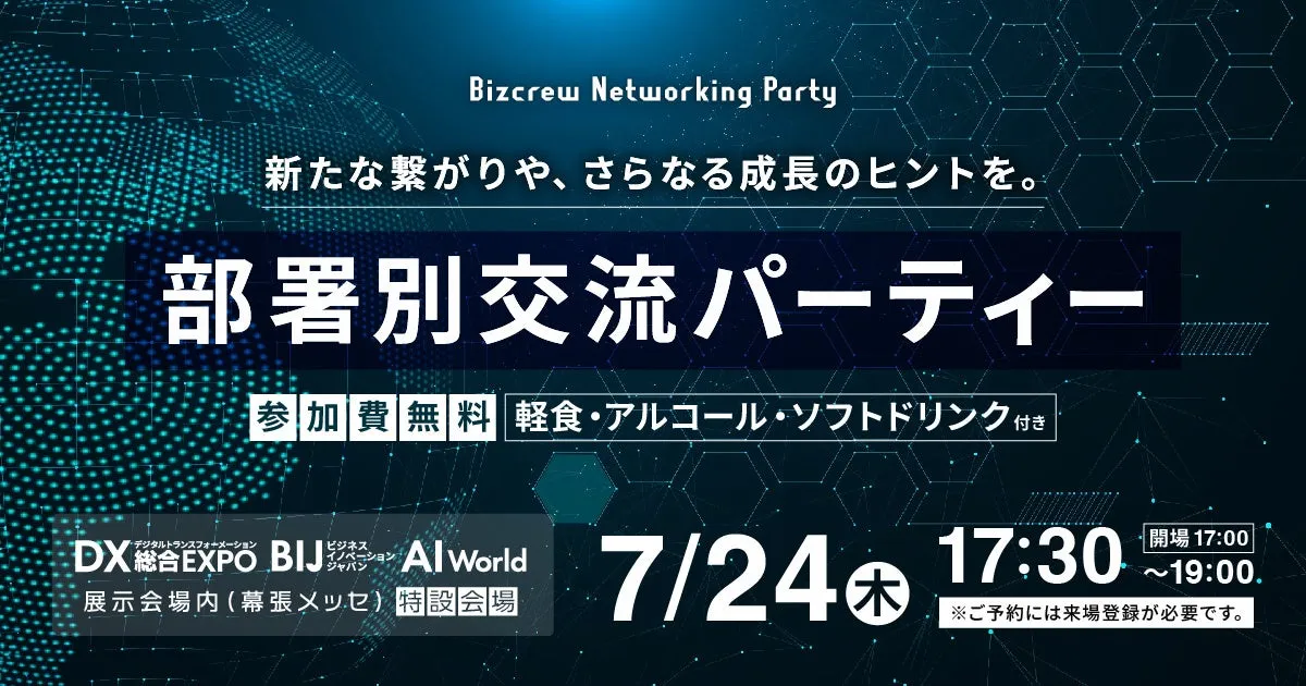 2025年7月23日から25日、幕張メッセで開催されるDX総合EXPO。その中でも特に注目を集めるのが、展示会の終了後に行われるネットワーキングパーティです。この初の試みは、参加者が同じ職種の仲間と交流し、業界の垣根を越えた貴重なネットワークを築く良い機会となります。
