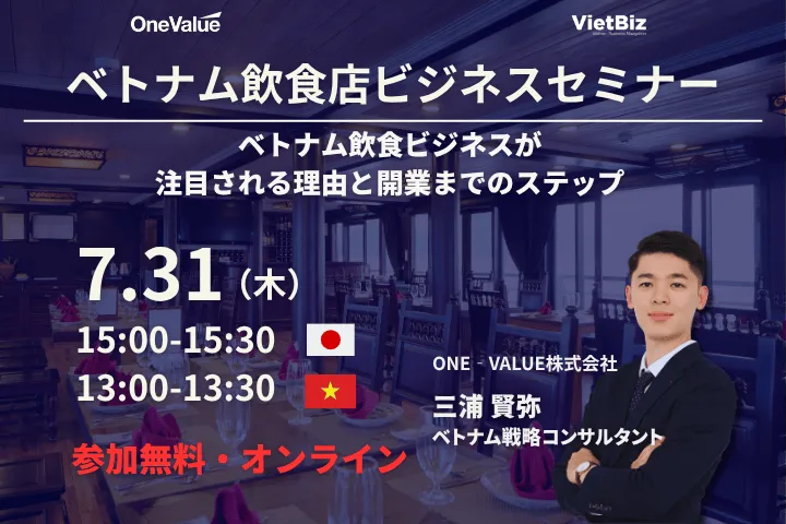 ONE-VALUE株式会社が主催する「ベトナム飲食ビジネスが注目される理由と現地への進出ステップ」という無料ウェビナーが、2025年7月31日(木)午後3時から開催されます。対象者は、日本国内で飲食ビジネスを展開したい企業や個人事業主で、参加費は無料ですが、事前の申し込みが必要です。