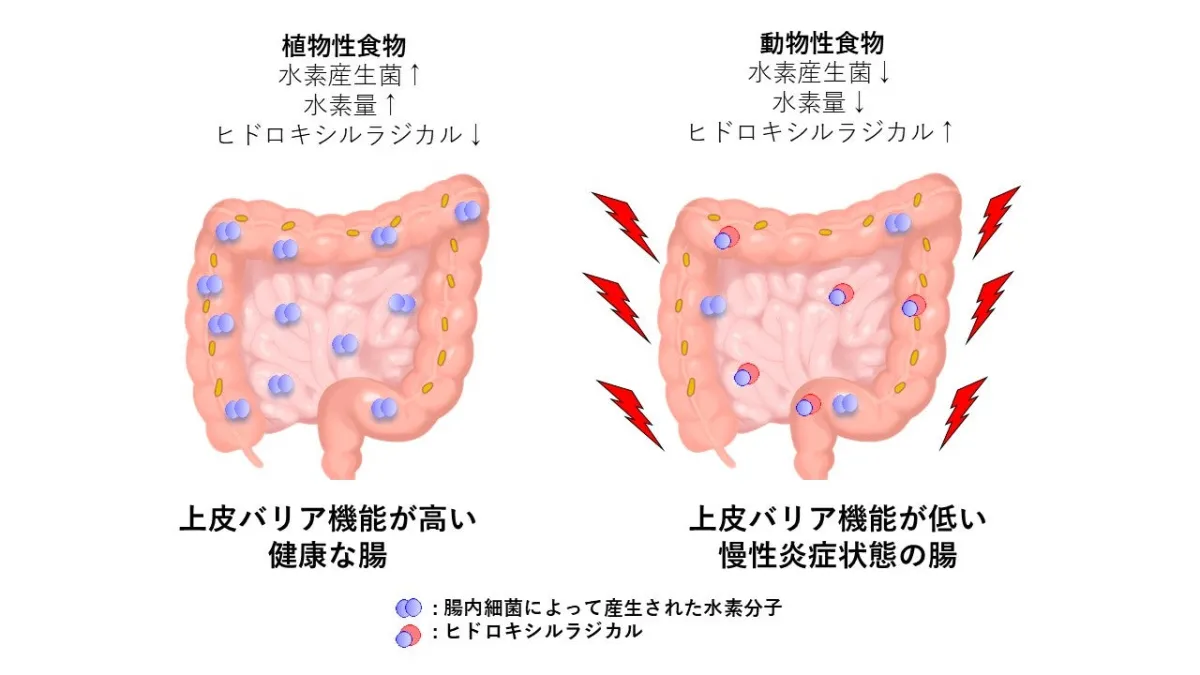 しかし、動物性食品の過剰摂取によって腸内細菌叢が変化し、水素の生成が減少することが懸念されています。この状況が持続することで、慢性の炎症状態が進行し潰瘍性大腸炎のリスクが高まるという悪循環が生じてしまうのです。