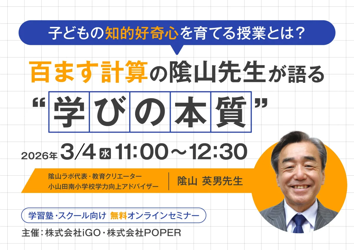 この度、2026年3月4日に開催されるオンラインセミナーでは、教育クリエーターの隂山英男氏をお招きし、子どもの知的好奇心を引き出す授業設計や、基礎学力の定着についてお話しいただきます。隂山氏は「百ます計算」の普及者として知られ、長年にわたって教育現場に実践的なアプローチを提供してきました。