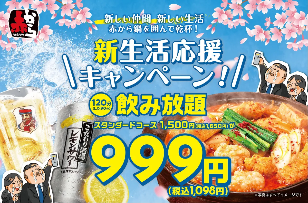 株式会社甲羅が展開する人気鍋料理店「赤から」では、2025年4月1日から5月6日までの期間で、新生活を迎える皆様を応援する「新生活応援キャンペーン」を開催します。このキャンペーンでは、通常1,500円(税込1,650円)の飲み放題スタンダードコースが、期間限定でたったの999円(税込1,098円)という特別価格で提供されます。春は出会いや新しいスタートの季節。この機会に赤からの鍋を囲みながら、友人や新しい仲間と楽しいひとときを過ごしましょう。