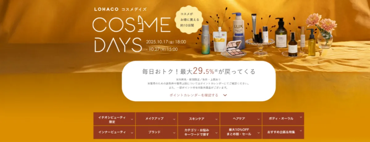 お友達や家族への贈り物、さらには自分へのご褒美と、秋の美しさを輝かせるための絶好の機会です。この機会にぜひ「LOHACO COSME DAYS」にアクセスして、お得なお買い物を楽しんでください!