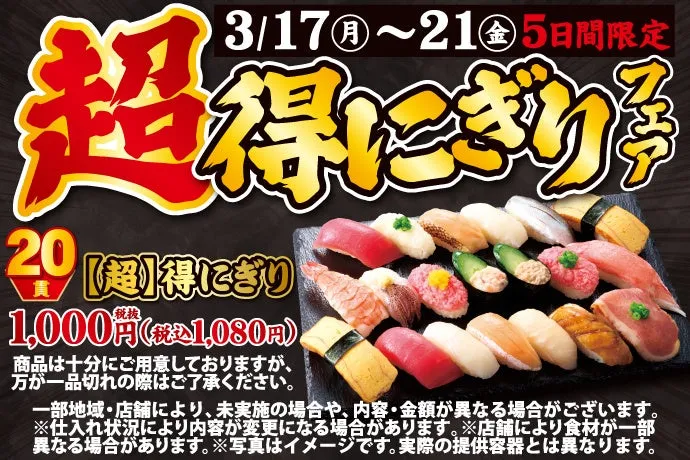 持ち帰り寿司の名店、小僧寿しが3月17日(月)から21日(金)までの期間限定で『超得にぎりフェア』を開催します。このイベントでは、スポットを当てたお得な商品がラインナップされ、多くの寿司ファンに楽しんでもらえる内容となっています。