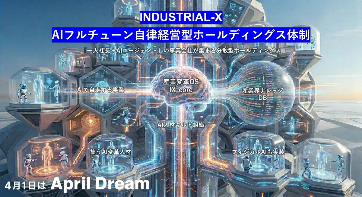 2026年4月1日、株式会社INDUSTRIAL-Xが企業の新たな経営形態を発表しました。AIを活用した「分散型ホールディングス体制」によって、全社員が独立した事業責任者(社長)として、自律的に経営を行うことが可能になります。この新しい形態は、従来のピラミッド型の組織構造を見直すもので、AI技術の進化により、組織の柔軟性を高め、変革のスピードを加速させることを目指しています。