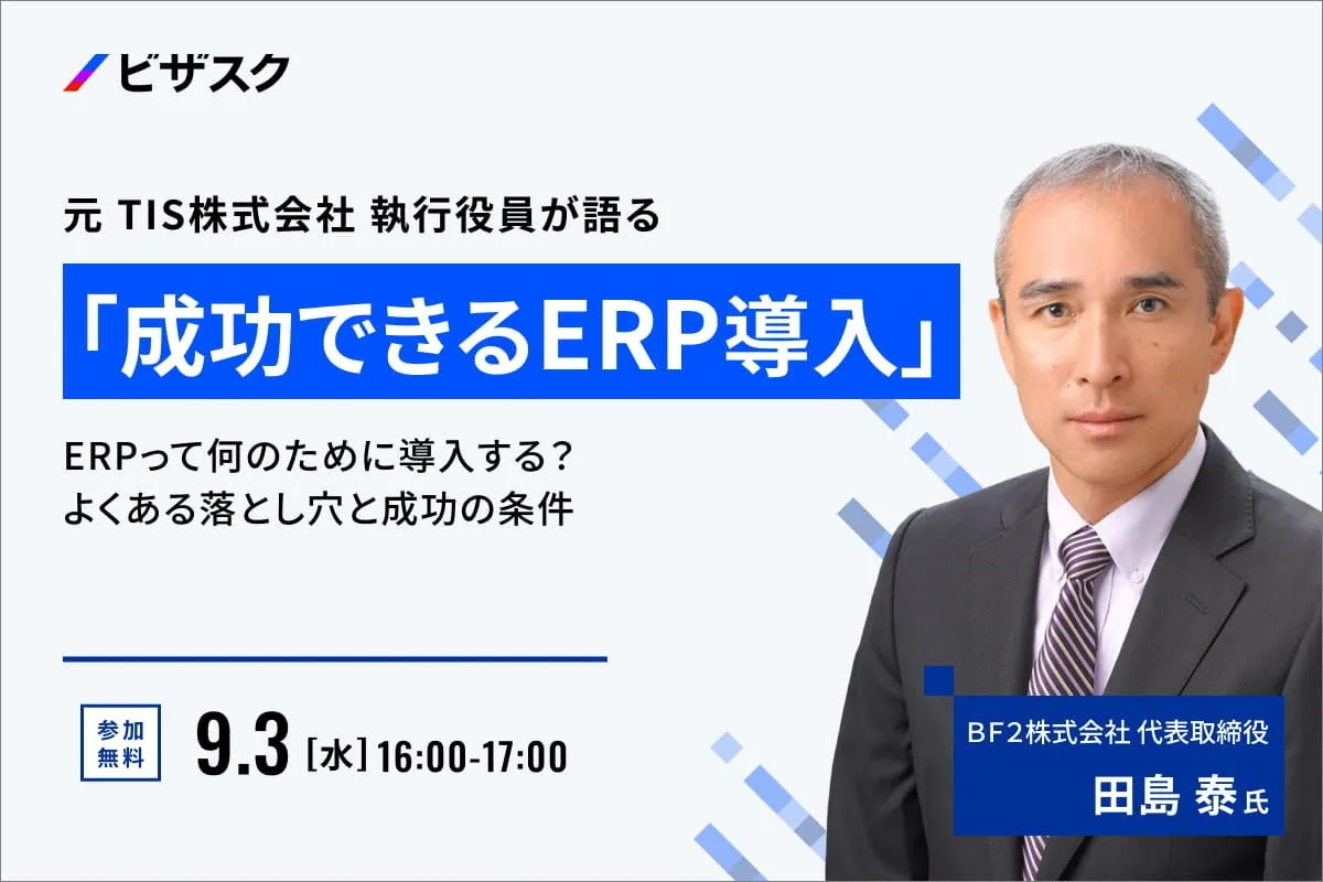 株式会社ビザスクが主催する無料のオンラインセミナー『成功できるERP導入』が、9月3日(水)16:00から開催されます。このセミナーでは、特別講師としてB.F.2株式会社の代表取締役である田島泰氏が登壇し、ERP導入の成功要因やよくある問題点についての貴重な知見を提供します。