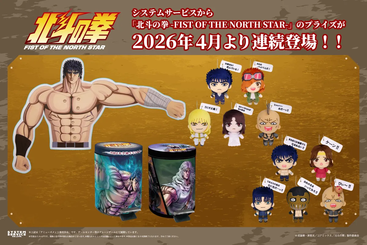 システムサービス株式会社は、2026年4月より「北斗の拳 -FIST OF THE NORTH STAR-」のプライズ商品をアミューズメント施設で順次展開することを発表しました。様々なアイテムが登場し、ファンの心をつかむことでしょう。