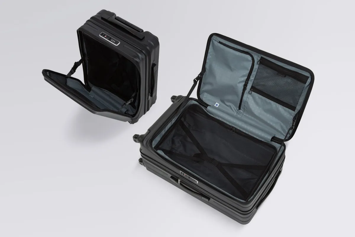 「フレスターEX」は、前面からメインの収納にアクセスできるフロントオープン仕様を採用し、従来のスーツケースに比較して使いやすさが格段に向上しました。特に機内持込サイズは縦向きに開閉できるため、狭いスペースでもストレスなく荷物の出し入れが可能です。預け入れサイズはスペースを無駄にせず、手早く開けられる設計になっています。