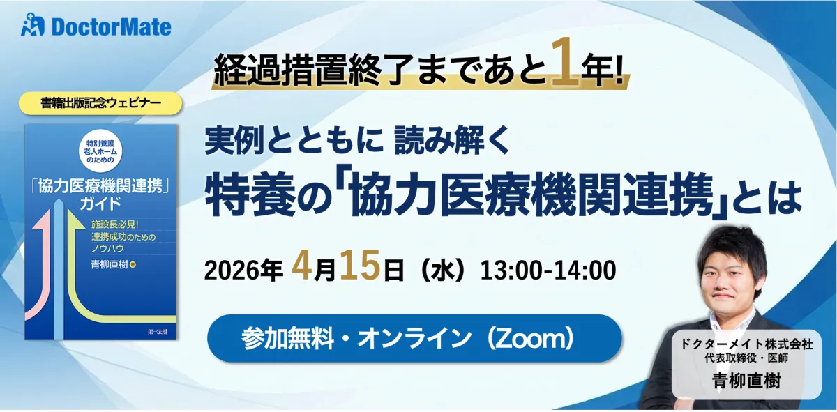 ドクターメイト株式会社が介護事業所向けの医療ソリューションを展開し、2026年3月下旬に新著『特別養護老人ホームのための「協力医療機関連携」ガイド』を出版しました。この書籍の内容をもとに、2026年4月15日(水)にはオンラインウェビナー『経過措置終了まであと1年!実例とともに読み解く特別養護老人ホームの「協力医療機関連携」とは』が開催されます。