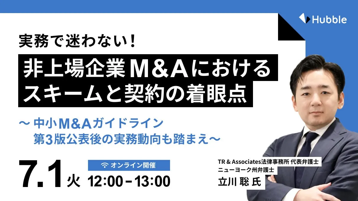 最近、企業の成長戦略においてM&A(合併・買収)が一層注目されており、特に非上場企業ではその重要性が増しています。特に、IPO(新規株式公開)が難しい状況が続く中、非上場企業にとってM&Aは一つの成長オプションとして大きな可能性を秘めています。このような背景の下、2025年7月1日(火)12:00から、株式会社Hubbleが主催するオンラインセミナー「実務で迷わない!非上場企業M&Aにおけるスキームと契約の着眼点」が開催されます。