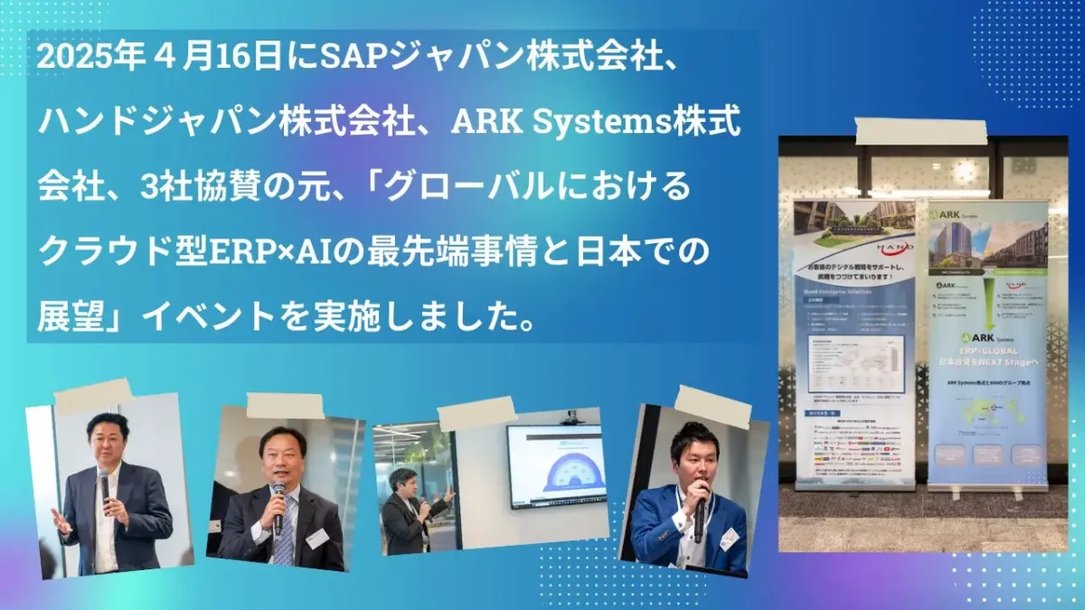 2025年4月16日、東京で開催された「グローバルにおけるクラウド型ERP×AIの最先端事情と日本での展望」と題されたセミナーは、現代ビジネスを支える新たな技術の導入についての重要な知見を提供しました。このイベントは、ARK Technology株式会社、ARK Systems株式会社、SAPジャパン株式会社、ハンドジャパン株式会社の共催により行われ、多くのビジネスパーソンが参加しました。
