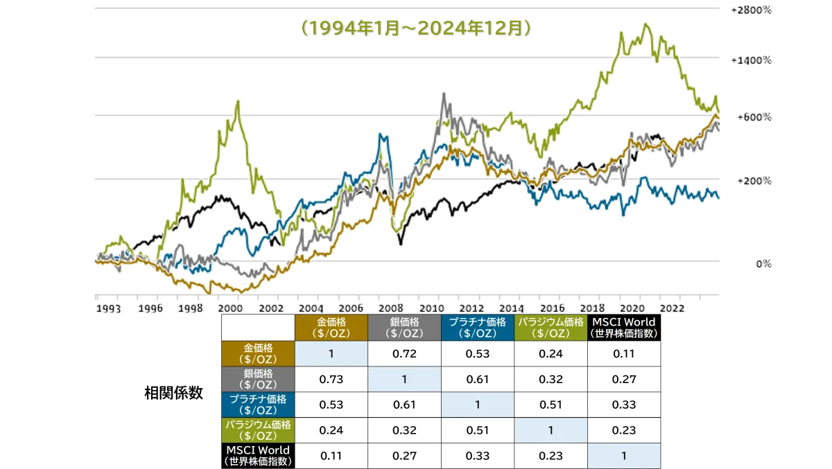 このように、プレシャスメタルと株式の相関係数が低いことは、二つの資産が互いに補完し合う関係にあることを示しています。これは、さらなる分散効果をもたらし、投資家にとって非常に有益です。