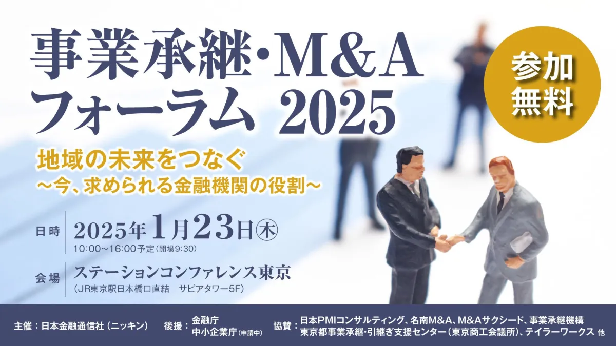 2025年1月23日、東京で「事業承継・M&Aフォーラム2025 地域の未来をつなぐ ~今、求められる金融機関の役割~」が開催されます。本フォーラムは、日本金融通信社(ニッキン)が主催し、株式会社日本PMIコンサルティングが協賛しています。