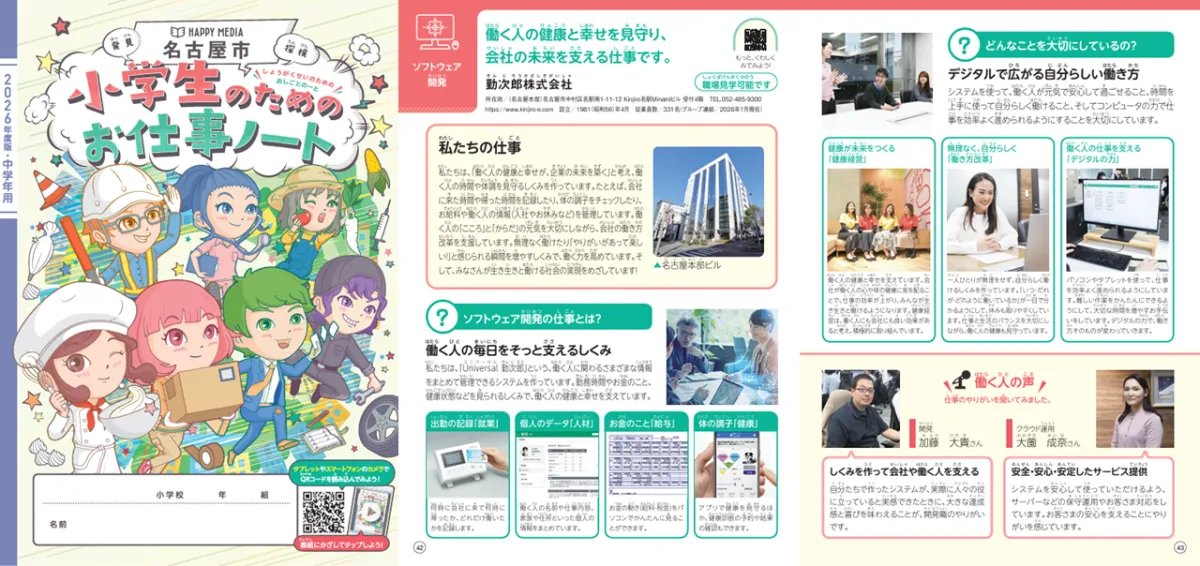 勤次郎株式会社(東京都千代田区、本社:代表取締役加村光造)は、文部科学省推進のキャリア教育を目的とした副教材「小学生のためのお仕事ノート(名古屋市版)2026年度」に協賛し、その内容が発表されました。この副教材では、IT業界での当社の取り組みや事業内容をわかりやすく紹介しており、名古屋市内の264校の小学校3年生に配布される予定です。