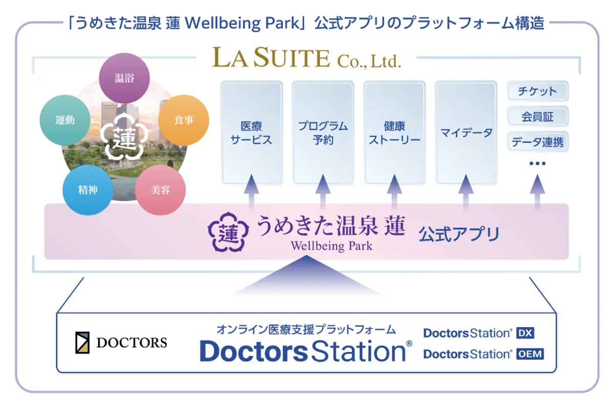 施設の公式アプリには、医療支援プラットフォーム「Doctors Station®」が採用されています。このシステムは、利用者に医療相談やオンライン診療を通じて、日常的な医療ケアを提供するものです。このように、温泉やフィットネスだけでなく、健康維持に必要な医療サービスをも組み込むことで、利用者の生活の質が向上することを目指しています。