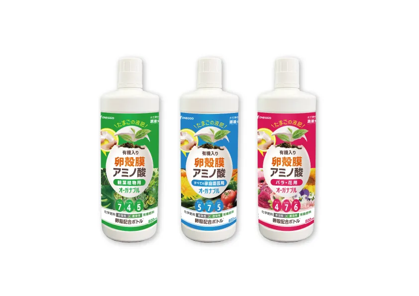 ENEGGOはこの素材に注目し、植物にとって重要なL型アミノ酸を18種類含む液体肥料として加工した。卵殻膜の70%以上はタンパク質であり、特許技術を用いてアミノ酸に分解することで、植物の成長をサポートする成分を直接供給できるのだ。光合成の不十分さや環境ストレスが原因で植物の自給自足が難しい場合、オーガナブルがその救世主となる。