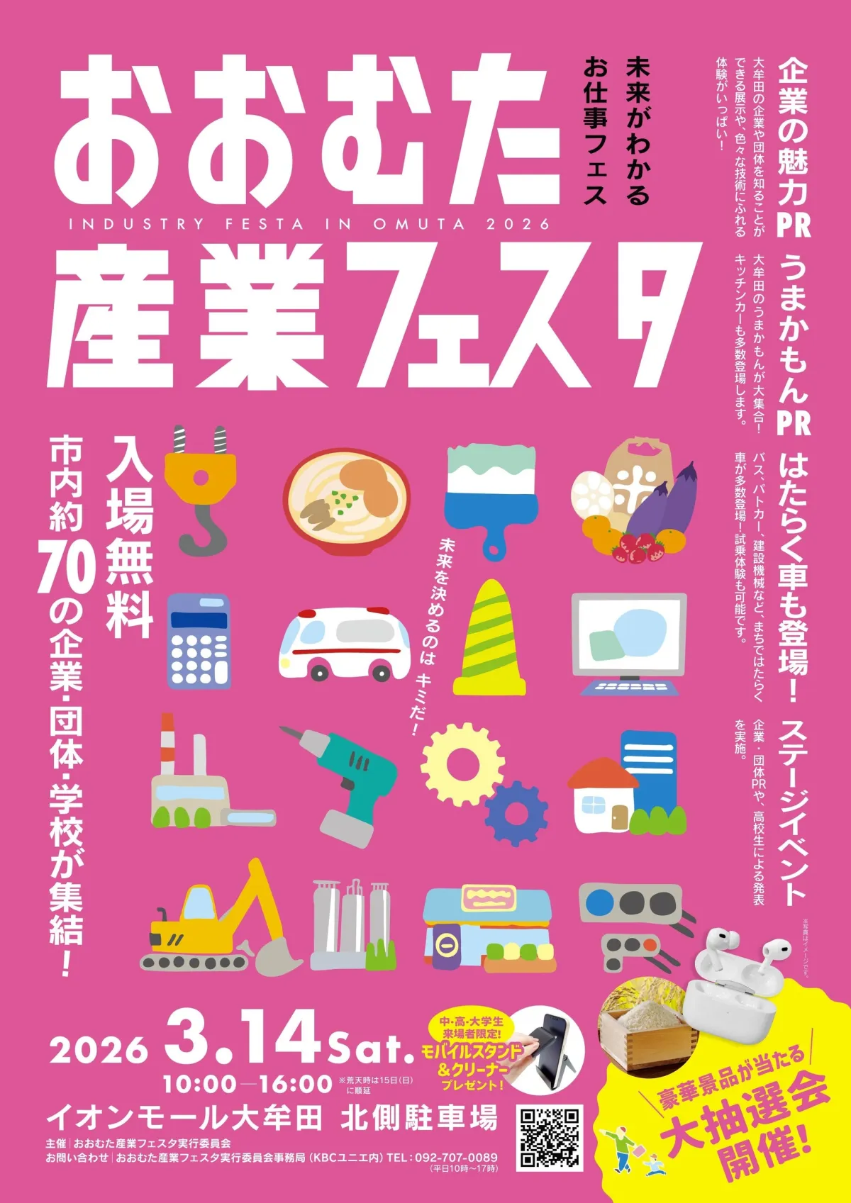 2026年3月14日(土)、福岡県大牟田市で「おおむた産業フェスタ」が開催されます。これは、地元の産業や企業の魅力を広め、特に地元の高校生などの若者たちに、地元就職を意識してもらうことを目的としたイベントです。過去2年間の成功を受けて、今回で3回目の開催となります。