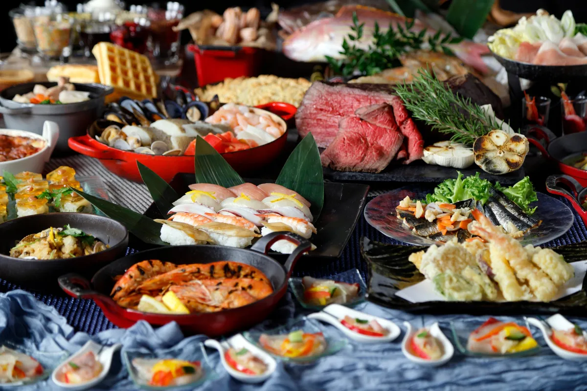 このブッフェでは、目の前で焼き上げる「有頭海老のグリル」をはじめ、魚介の旨味を引き出した「魚介とトマトの白ワイン蒸し」など、シーフードファンにはたまらない料理が勢揃い。また、ランチ限定の「カンジャンセウの太巻き」や5種類から選べる「にぎり寿司」など、多彩な味わいが楽しめます。