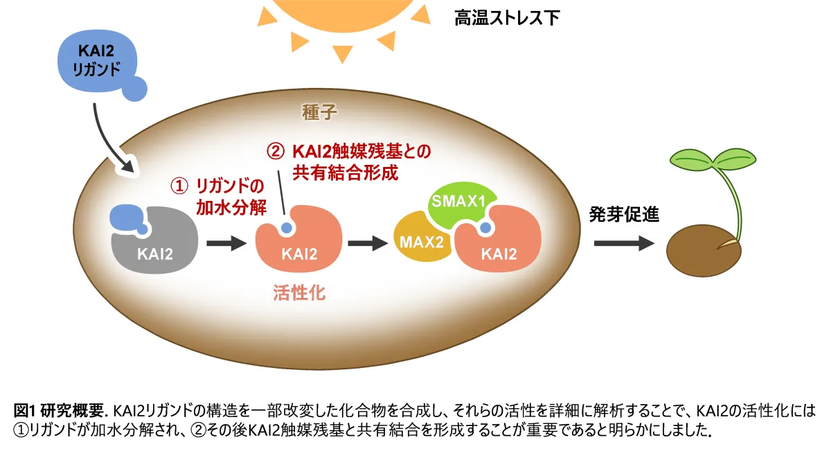 KAI2は、植物ホルモンの一種であるストリゴラクトンの受容体D14の親戚です。過去の研究により、KAI2が高温環境での植物の休眠や発芽の調節に寄与していることが示されました。しかし、KAI2が結合する植物内生リガンド(KL)が特定されていなかったため、その活性化メカニズムが解明されていなかったことが問題でした。
