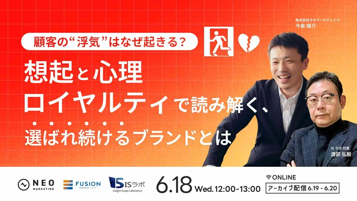 株式会社ネオマーケティングとフュージョン株式会社が共同で開催するウェビナー『顧客の“浮気”はなぜ起きる?想起と心理ロイヤルティで読み解く、選ばれ続けるブランドとは』は、ブランドに関する最新の調査を基にした貴重な情報を提供します。このウェビナーでは、顧客がなぜあるブランドから他のブランドにスイッチしてしまうのか、その背後に潜む心理や感情的要因を探ります。