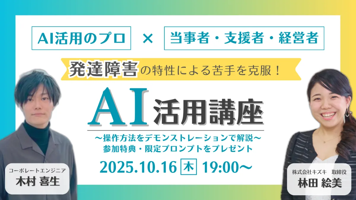 この無料オンライントークイベントでは、発達障害による仕事の苦手を克服するための『AI攻略法』をテーマに取り上げます。大手IT企業でAI分野の専門家として活躍する木村喜生氏と、株式会社キズキの最年少取締役で発達障害当事者でもある林田絵美氏が登壇。具体的なAIの活用法をデモンストレーションを通じて紹介し、参加者がその知識を今すぐ業務改善に役立てられるようにサポートします。