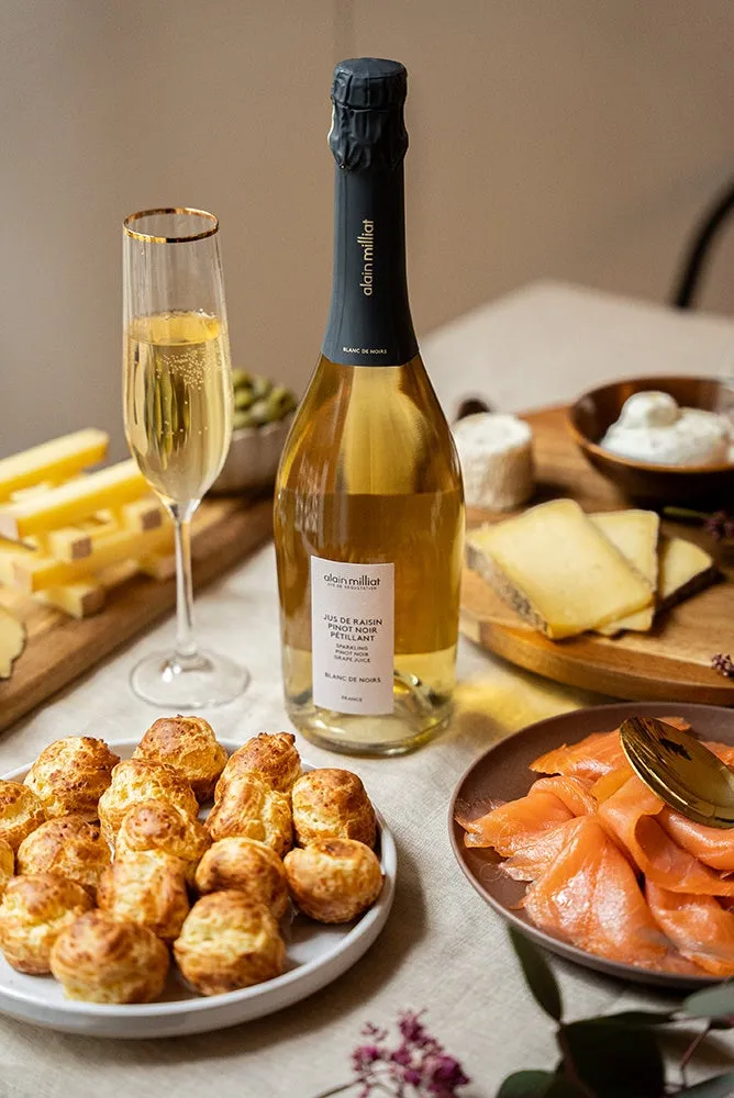「ブラン・ド・ノワール」とは、黒ブドウを使用して白ワインを作る伝統的なシャンパーニュの製法。この製品もフランス・ガイヤック産のピノ・ノワールをもとに淡い黄金色のジュースに仕上げられています。この繊細で美しいジュースは、シャンパーニュのようにエレガントで、テーブルを華やかに演出します。