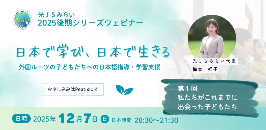 日本での生活を送る外国ルーツの子どもたちに対するサポートが、ますます重要な課題となっています。光JSみらいは、これまで外国にルーツを持つ子どもたちへの日本語指導や学習支援を行ってきました。その活動の一環として、新たなウェビナーシリーズが始まります。このウェビナーは、外国ルーツの子どもたちに対する理解を深め、彼らにとっての適切な支援のあり方を考える場として設計されています。