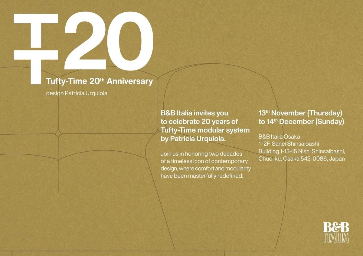 B&B Italia Osakaが主催する「Tufty–Time 20(タフティータイム20)」の特別展示が2025年11月13日から12月14日までの間、開催されます。これは、2005年に誕生した「Tufty–Time」が20周年を迎えるにあたり、その最新モデルが初披露される機会です。