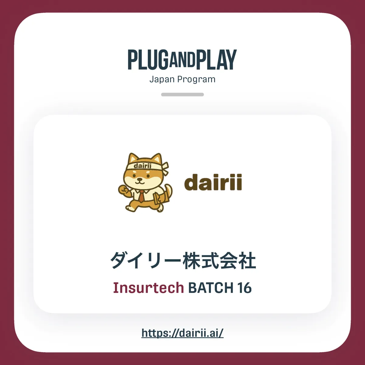 ダイリー株式会社(以下「dairii」)は、Plug and Play Japanが実施するアクセラレータープログラム「Winter 2025 Batch」内のInsurtech分野に選ばれたことを発表しました。このプログラムは、高度なイノベーションの創出を目的としており、大企業とスタートアップを結びつけることで新たな価値の創出を図っています。